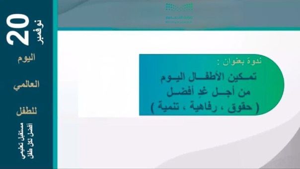 وقال المساعد للشؤون التعليمية أن الأطفال هم بناة المستقبل ‏‎ومن واجبنا كمجتمع ومؤسسات أن نحرص على تهيئة كل الظروف الممكنة لنموهم وتطويرهم بالشكل السليم ‏‎ وأضاف أن الاستثمار في الأطفال هو الاستثمار في المستقبل المشرق وذلك من خلال الإهتمام بالطفل وتقديم المزيد من الرعاية من خلال التعليم النوعي، وغرس القيم الأخلاقية والإنسانية، وتوفير مساحات آمنة وممتعة للتعلم ، لتحقيق رؤية المملكة 2030، تناولت الندوة محاور عدةً منها بناء الوعي الفكري لدى الأطفال ، حيث اهتم الإسلام بهذه المرحلة العظيمة التي هي أساس البناء،حيث دعى الى الرفق بالطفل وإكرامه،وأهمية غرس القيم الدينية كالتعاون والأمانة واحترام الآخرين، والإهتمام بغرس القيم الوطنية كحب الوطن والاخلاص له والافتخار به،وكذلك شرحًا وافيًا لحقوق الطفل من خلال التعرف على نظام الحماية من الإيذاء، والمحظورات المتصلة بحماية الطفل، وماهي حقوق الطفل في الأنظمة الدولية ، وكذلك محور حقوق الطفل في المنظور الدولي المقارن،وكيف اهتم الإسلام بمرحلة الطفولة ، وتعريفًا بالهدي النبوي في التعامل مع الأطفال.