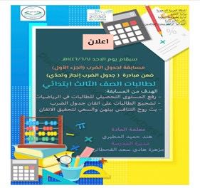 نفذت الابتدائية الرابعة ببحرة المجاهدين التابعة لمكتب بحرة بالإدارة العامة للتعليم بمنطقة مكة المكرمة، مسابقة الرياضيات بعنوان "مسابقة جدول الضرب إنجاز وتحدي"، نفذته معلمة الرياضيات هند المطيري، بمشاركة رائدات الصف الثالث في تفعيل المسابقة، استهدفت المسابقة طالبات الثالث، وذلك بهدف رفع المستوى التحصيلي للطالبات في مادة الرياضيات، وتشجيعهن على إتقان جدول الضرب، وبث روح التنافس بينهن والسعي لتحقيق الإتقان .