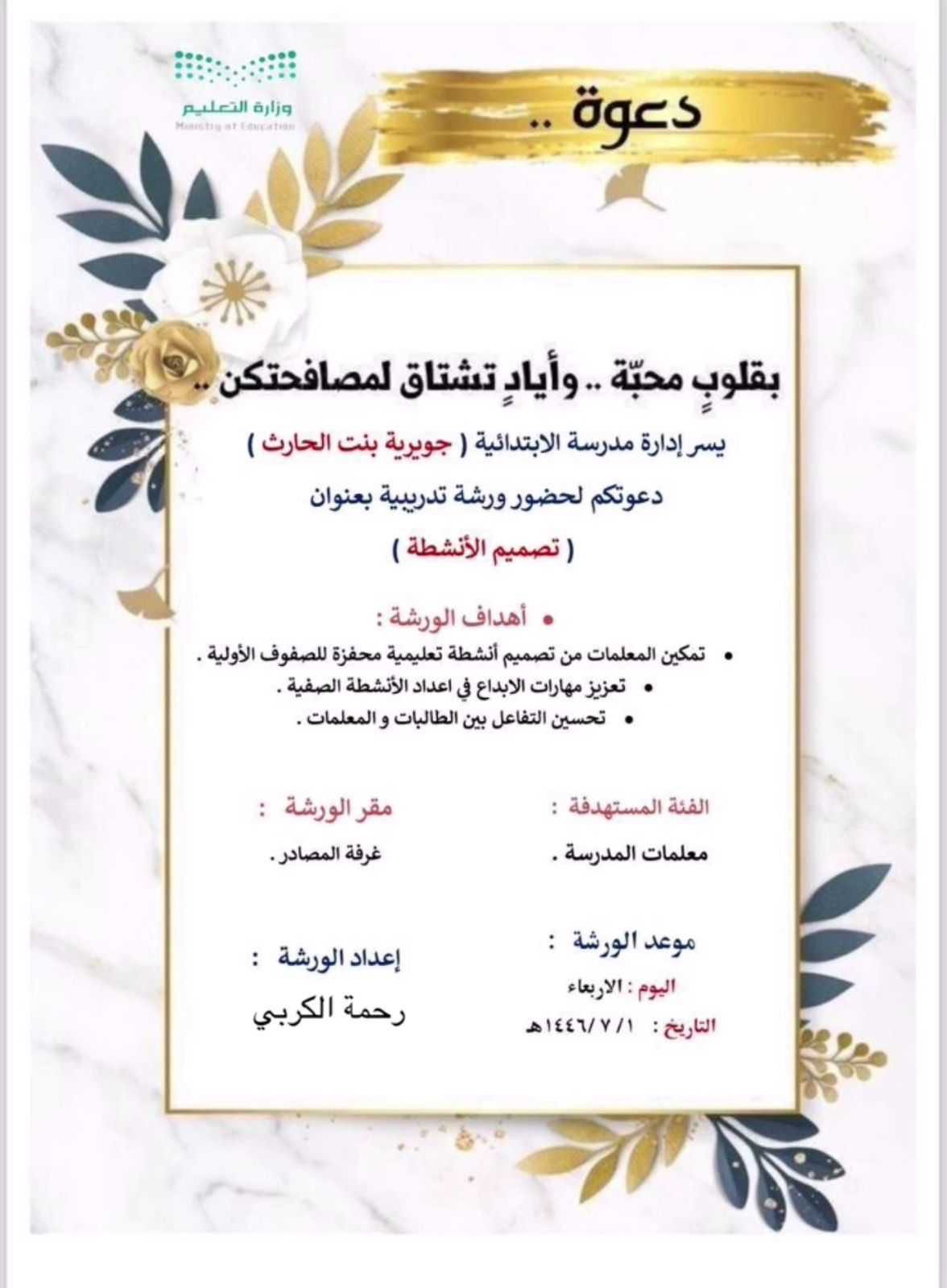 نفذت مدرسة جويرية بنت الحارث الابتدائية التابعة لإدارة تعليم مكتب التنعيم بالإدارة العامة للتعليم بمنطقة مكة المكرمة ورشة عمل بعنوان "الأنشطة الصفية" يوم الأربعاء الموافق 1 / 7 / 1446هـ ، نفذتها المعلمة رحمة الكربي بمساندة مشرفة الدعم حصة العتيبي ، وذلك بحضور مديرة المدرسة عائشة السلمي.