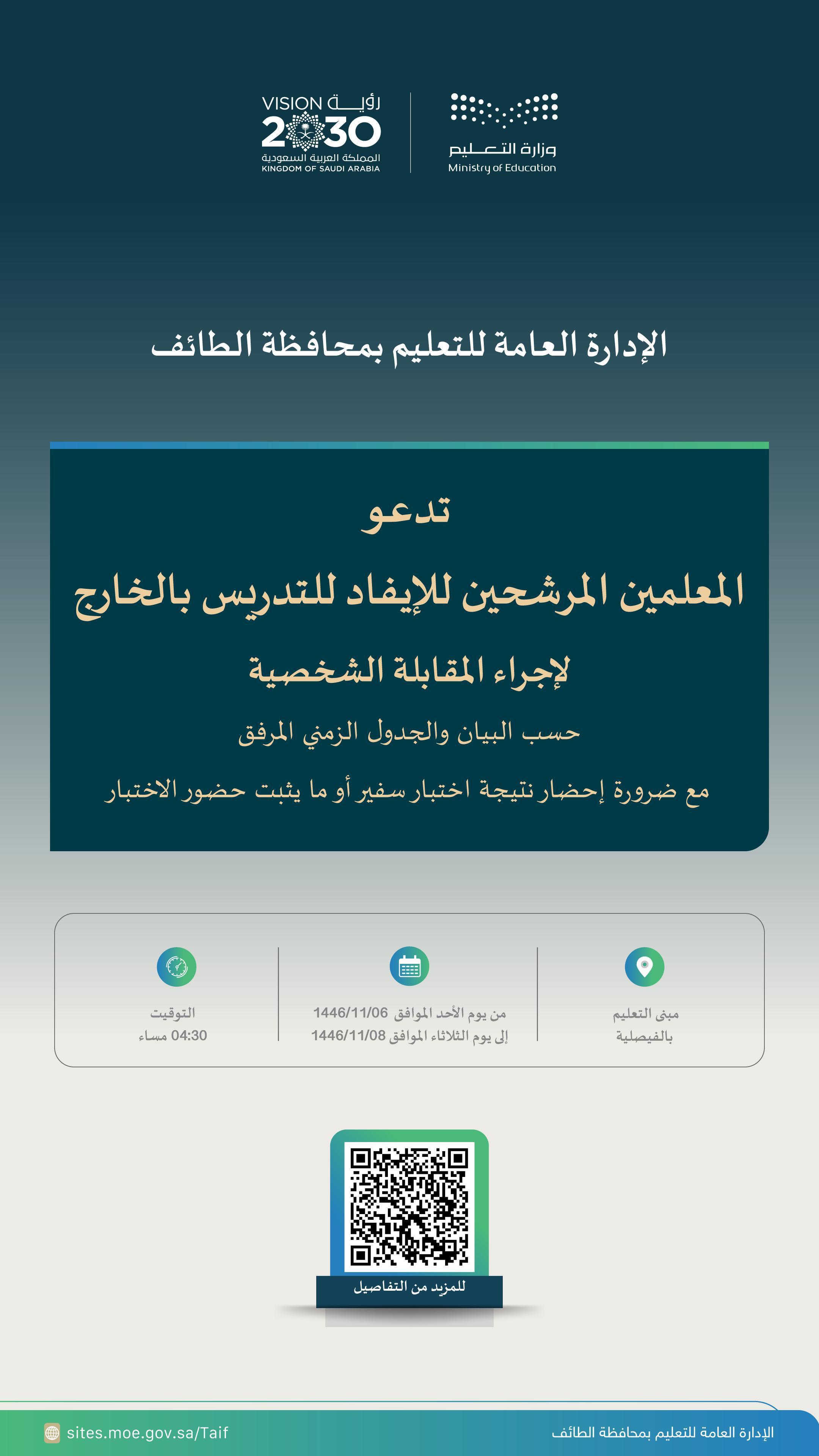 دعت الإدارة العامة للتعليم بالطائف المعلمين المرشحين للتدريس بالخارج للعام الدراسي 1447هـ لحضور المقابلات الشخصية اعتباراً من يوم غد الاحد الموافق 06/11/1446 هـ في تمام الساعة 04:30 عصراً في مبنى الإدارة العامة للتعليم بالفيصلية حسب المواعيد المرسلة على جوالاتهم .