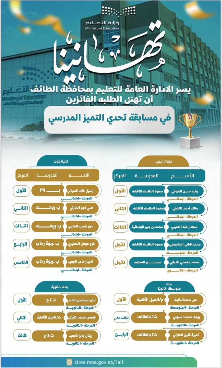 تعليم الطائف يهنئ الفائزين في “تحدي التميز المدرسي” لعام 1446هـ