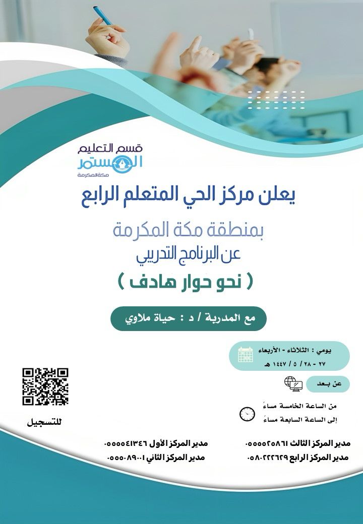 نفذت الإدارة العامة للتعليم بمنطقة مكة المكرمة، ممثلةً بإدارة أداء التعليم - قسم التعليم المستمر، برنامجًا تدريبيًا بعنوان "نحو حوار هادف "، يومي الأربعاء و الخميس ، ( عن بعد ) بمركز الحي المتعلّم الرابع بثانوية ابن رشد الليلية، نفذته المدربة الدكتورة / حياة ملاوي، تحت إشراف رئيسة قسم التعليم المستمر أ. دلال اللحياني، ومتابعة من المشرفة التربوية أمل باعبدالله، استهدف البرنامج المجتمع المحلي، وذلك بهدف تعريف المستفيدين بمفهوم الحوار الهادف ومبادئه وأهميته في تقوية العلاقات الاجتماعية، وتنمية مهارات التواصل الفعّال مثل الإصغاء النشط ،وطرح الأسئلة الصحيحة ، والتعبير الواضح عن الأفكار ، وتعزيز قدرة المشاركين على إدارة الخلافات بطريقة إيجابية ، والابتعاد عن الحوارات الجدلية غير المفيدة، واكتساب أساليب التحكّم في الانفعالات أثناء النقاش ، والمحافظة على لغة راقية في الطرح ، وتعزيز دور الحوار الهادف في حل المشكلات المجتمعية وبناء جسور الثقة بين الأفراد .
