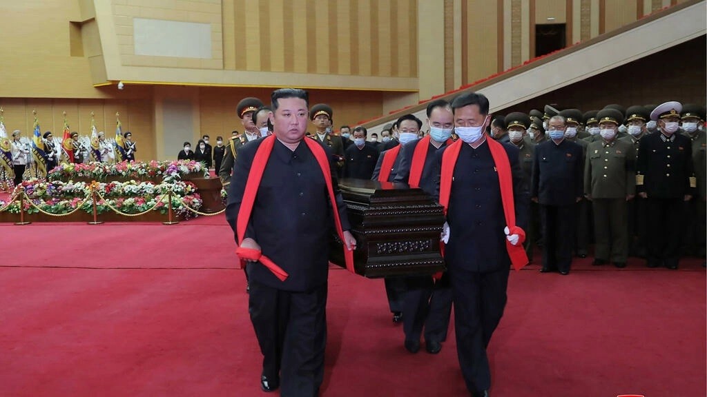 ونشرت وكالة الأنباء المركزية الكورية الشمالية الرسمية صورا لكيم بدون كمامة وهو يشارك في حمل نعش هيون الذي توفي عن عمر عن يناهز 87 عاماً.