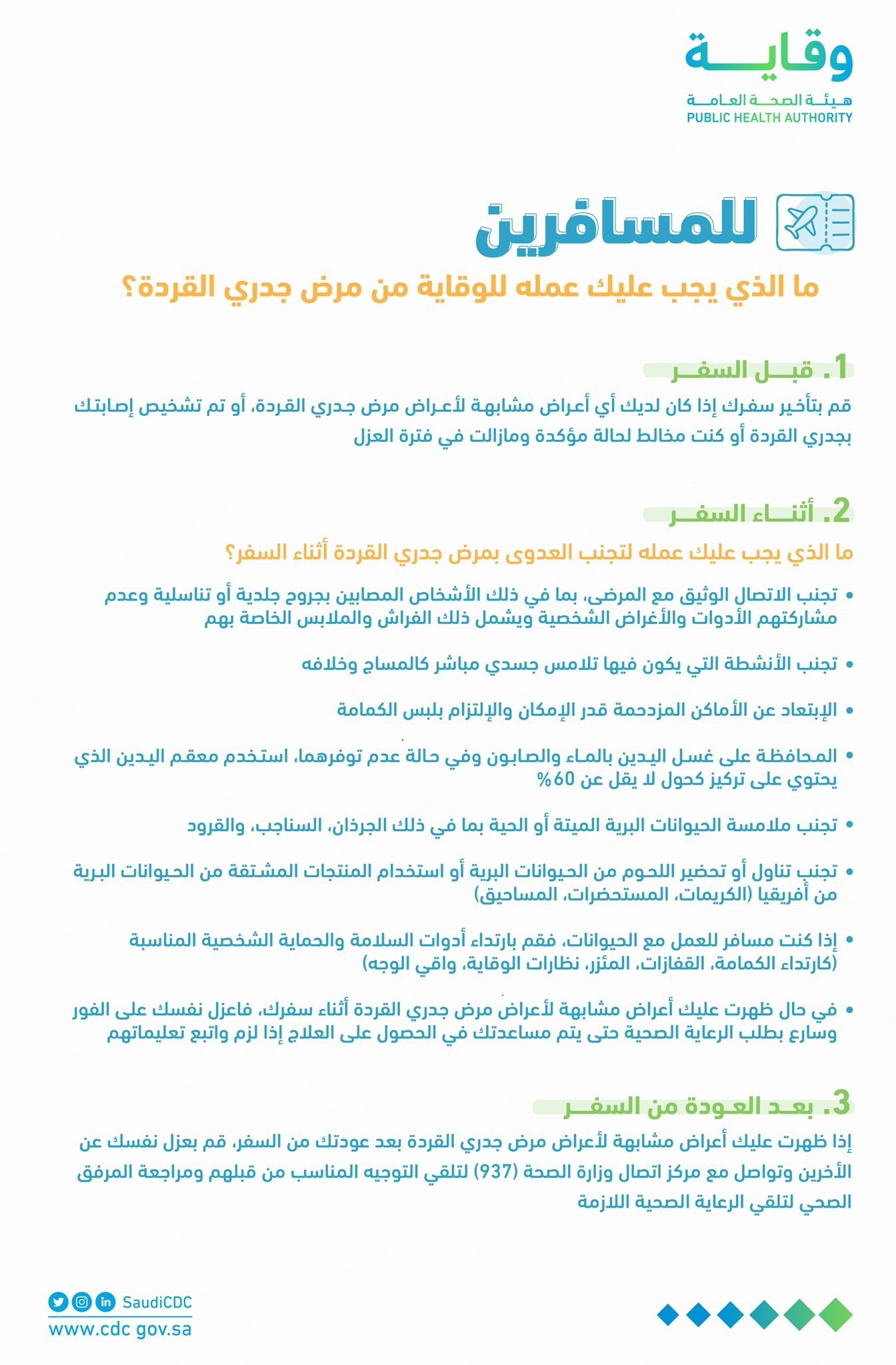 قدمت هيئة الصحة العامة، عدة نصائح للمسافرين؛ للوقاية من الإصابة بفيروس "جدري القردة"، وأنه قبل السفر، لا بدّ من تأخير السفر حال ظهور أي أعراض مشابهة لأعراض المرض، أو تشخيص الإصابة به، أو في حالة مخالطة حالة مؤكدة لا تزال في فترة العزل.