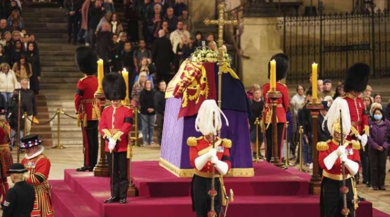 وتنتهي في الساعة 05.30 بتوقيت غرينتش فترة تسجية جثمان الملكة بعد أربعة أيام اصطف خلالها مئات الآلاف في طابور أمام نعش أطول ملوك بريطانيا جلوسا على العرش في قاعة وستمنستر التاريخية في لندن.