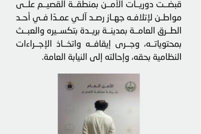 الحدث - محمد العتيق قبضت دوريات الأمن بمنطقة القصيم على مواطن لإتلافه جهاز رصد آلي بأحد الطرق العامة بمدينة بريدة...