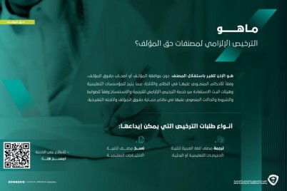 أعلنت الهيئة السعودية للملكية الفكرية عن إطلاق خدمة الترخيص الإلزامي لمصنفات حقوق المؤلف والتي تتيح للمؤسسات التعليمية وهيئات البث...