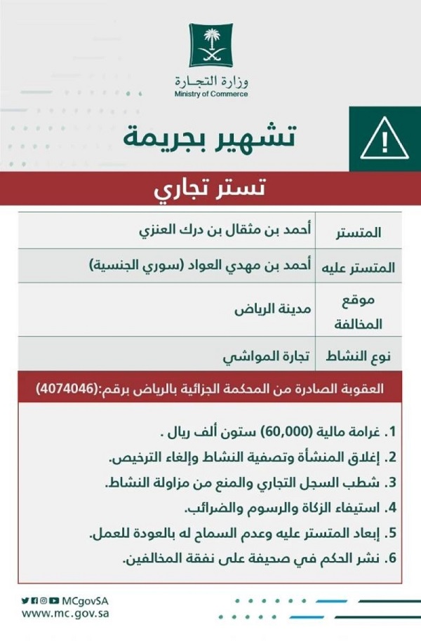 كشفت وزارة التجارة تفاصيل التشهير بالمواطن أحمد بن مثقال بن درك العنزي ومقيم سوري يدعى أحمد بن مهدي العواد بعد صدور حكم قضائي يدينهما بارتكاب جريمة التستر في تجارة المواشي بمدينة الرياض.