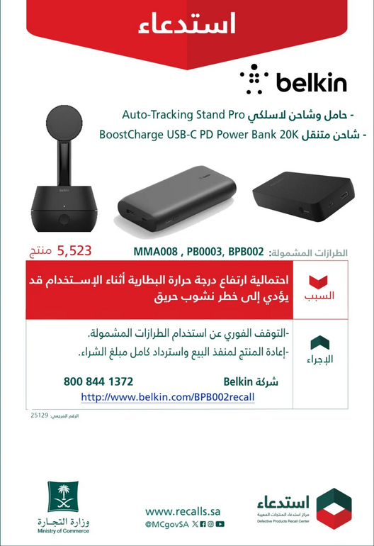 أعلنت وزارة التجارة، اليوم (الأحد)، استدعاء 5.5 ألف حامل وشاحن لاسلكي belkin، لاحتمالية ارتفاع درجة حرارة البطارية أثناء الاستخدام؛ قد يؤدي إلى خطر نشوب حريق.