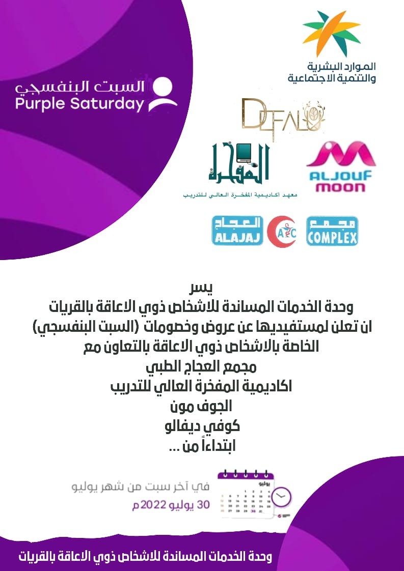 فعلت وحدة الخدمات المساندة للاشخاص ذوي الاعاقة بالقريات مبادرة (السبت البنفسجي) التي اعلنتها هيئة رعاية الاشخاص ذوي الاعاقة وتوافق السبت الاخير من شهر يوليو 30 يوليو 2022 والذي يهدف إلى وجود العروض والتخفيضات للأشخاص ذوي الإعاقة، والمزايا والخدمات المقدمة لهم، ورفع مستوى الوعي عن احتياجات الأشخاص ذوي الإعاقة إلى جانب الدمج الشامل في المجتمع وتحفيز القطاع الخاص؛ لتقديم البرامج التي من شأنها تعزيز سهولة الوصول وضمان جودة الخدمات المقدمة.