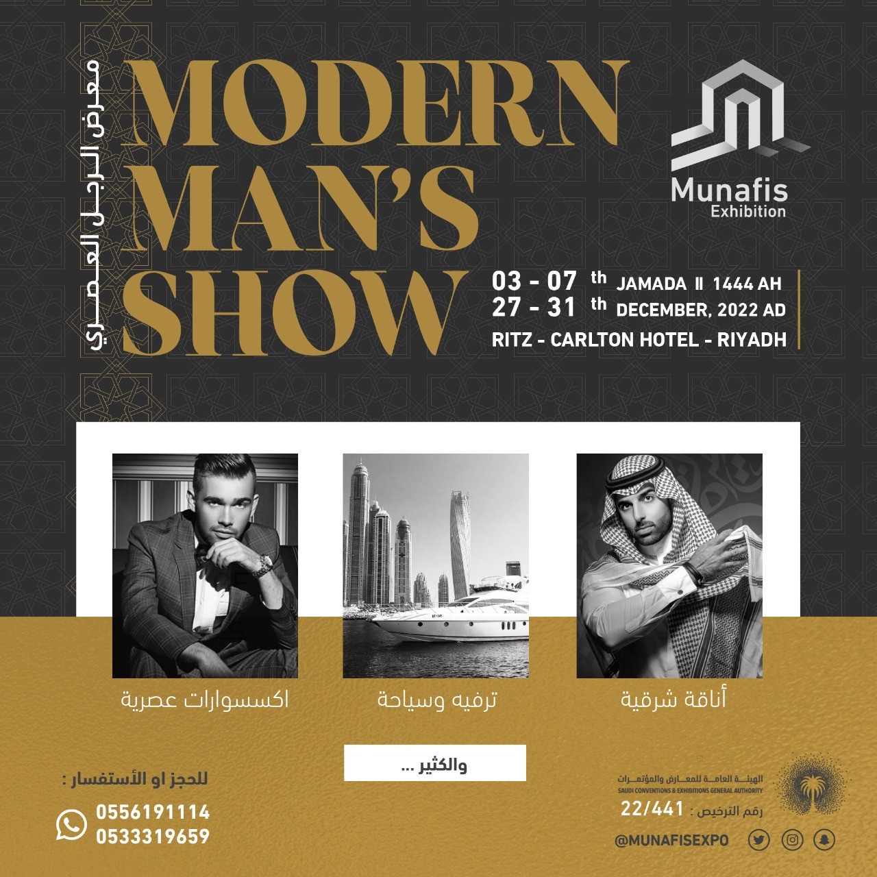 تستضيف مدينة الرياض معرض الرجل العصري بنسخته الأولى بفندق الريتز كارلتون من 03-07 جمادى الثاني 1444 هـ الموافق 27-31 ديسمبر 2022 م بنتظيم شركة منافس للمعارض و المؤتمرات .