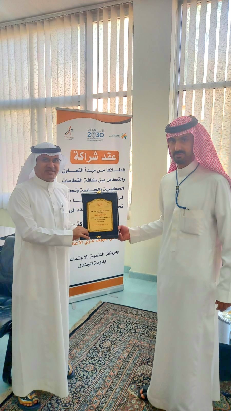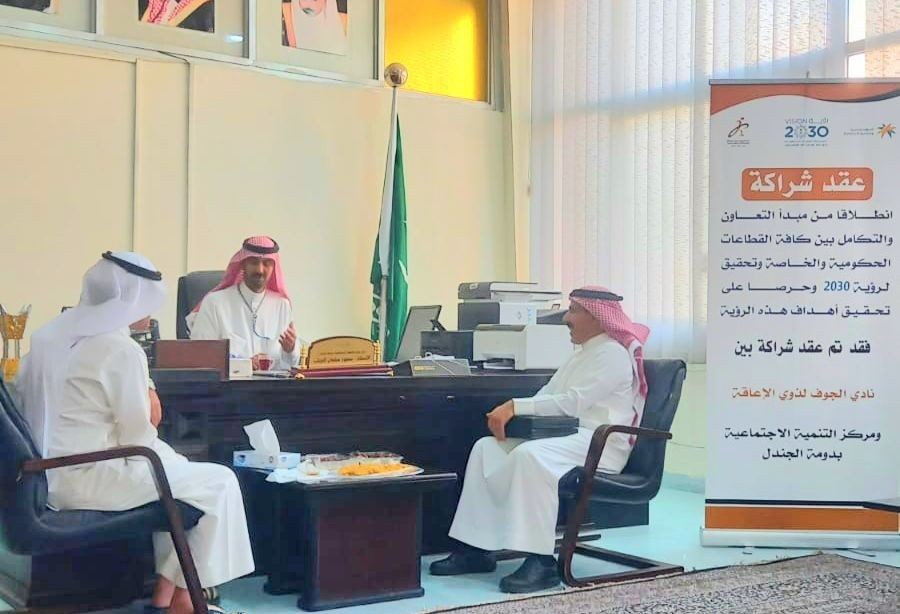 وقع مركز التنمية الاجتماعية بمحافظة دومة الجندل  عقد شراكة مع نادي الجوف للاشخاص ذوي الاعاقه ، مثل مركز التنمية مدير المركز أ/سعود سلمان الجباب و مثل النادي  رئيس النادي أ/ فهيد عشوي الشمري.