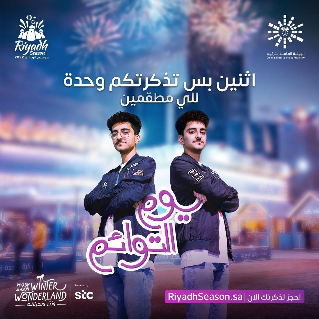 أعلن معالي المستشار تركي بن عبدالمحسن آل الشيخ، رئيس مجلس إدارة الهيئة العامة للترفيه إتاحة دخول التوائم بالزي الموحد غدا الخميس، إلى منطقة "ونتر وندرلاند" بتذكرة واحدة، تتيح لهم قضاء أول أيام الإجازة المطولة في مدينة الألعاب الترفيهية ومرافقها المتنوعة.