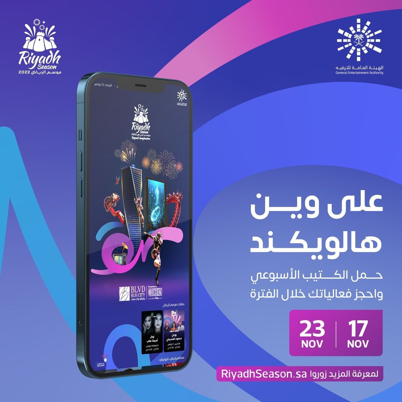أطلق موسم الرياض 2022 كتيبًا مختصرًا للفعاليات المميزة التي ستقام في نهاية الأسبوع من يوم 17 نوفمبر الجاري وحتى 23 من الشهر نفسه، وذلك في مناطق "بوليفارد رياض سيتي"، "المربع"، "رياض سكاي"، "ذا جروفز"، "ونتر وندرلاند"، "رياض زوو"، وأخيرا حديقة السويدي، وهي من المناطق الترفيهية الـ15 للموسم.