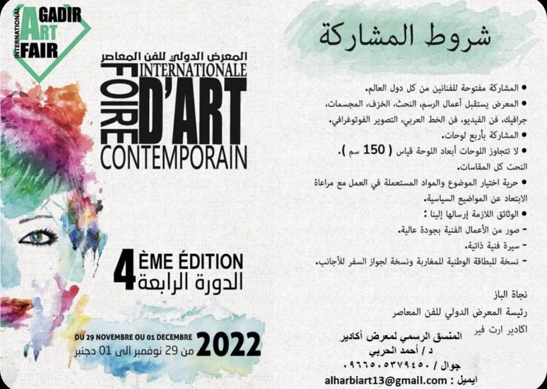 أعلن نائب رئيس مسلة آرت الدكتور : أحمد بن يوسف الحربي ، عن بدء التسجيل للفنانين والفنانات للمشاركة في معرض الفن المعاصر في دورته الرابعة والذي سيقام في مملكة المغرب في نهاية نوفمبر 2022 م ، و الذي سيكون تحت شعار ( الفن إنعكاس لثقافة الشعوب ) وذلك بحضور العديد من الشخصيات الفنية العالمية.
