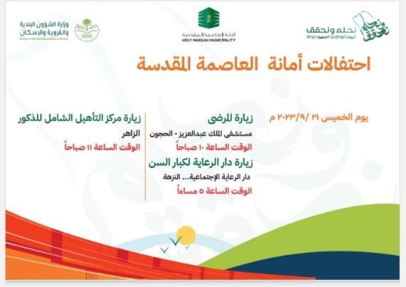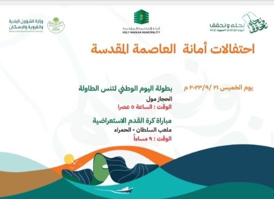 كما أطلقت الأمانة بمناسبة الإحتفاء باليوم الوطني السعودي٩٣ تحت شعار " #نحلم_و_نحقق" العديد من الفعاليات والأنشطة المتنوعة بمواقع متفرقة بالعاصمة المقدسة ، وتستمر لمدة ثلاثة أيام ابتداء من صباح اليوم الخميس ٢١ سبتمبر بمشاركة الجهات المعنية ، والقطاع الخاص ، للإحتفال بهذه المناسبة ، وتعزيز الإنتماء للوطن والتأكيد على التلاحم والترابط بين مختلف فئاته والتعريف بأعمال ومنجزات الدولة الرشيدة".