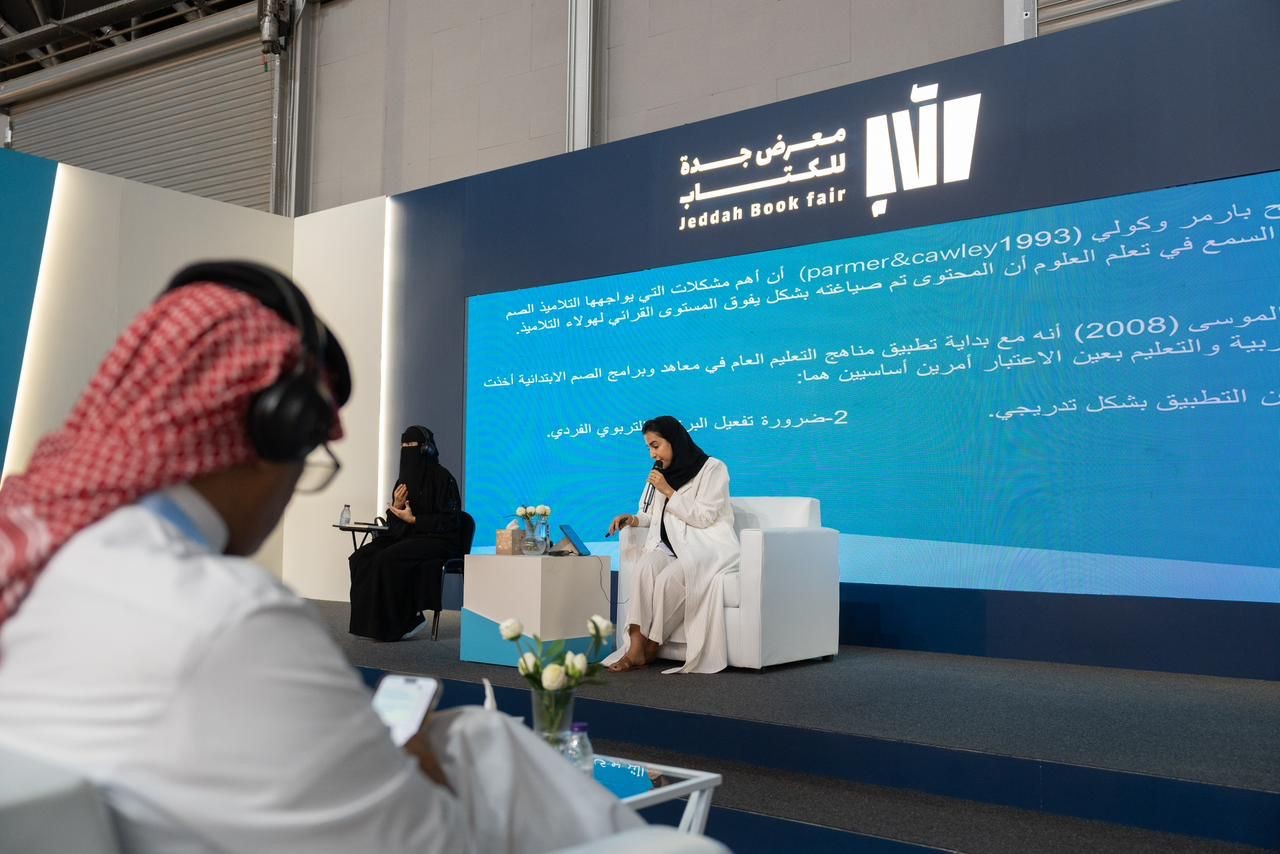تناول معرض جدة للكتاب 2023 المناهج الدراسية ومحاولة مواءمتها مع الأطفال ذوي الإعاقة السمعية، وذلك من خلال ورشة قدمتها الباحثة في مجال الإعاقة السمعية علياء العمر، بعنوان "تكييف المناهج للتواصل مع الأطفال ذوي الإعاقة السمعية".