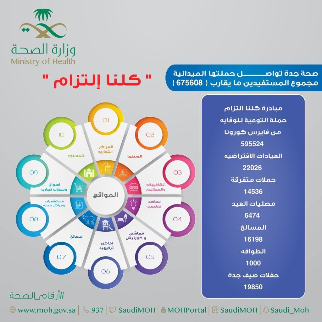 تواصل الفرق التوعوية بصحة جدة ممثلة في إدارة التواصل والعلاقات والتوعية جهودها في الحملة التوعوية الميدانية (كلنا إلتزام)، والتي أنطلقت منذ ما يقارب الشهرين الماضية، و لا زالت إلى مستمرة في مختلف المواقع بمدينة جدة و التي تشمل المراكز التجارية ، ودور السينما والمساجد، بالإضافة إلى الكافيهات والمطاعم والأسواق والمجمعات التجارية والمعاهد التعليمية، وكذلك المماشي والكورنيش ، والأماكن الترفيهية، والمسالخ والمستشفيات والمراكز الصحية.