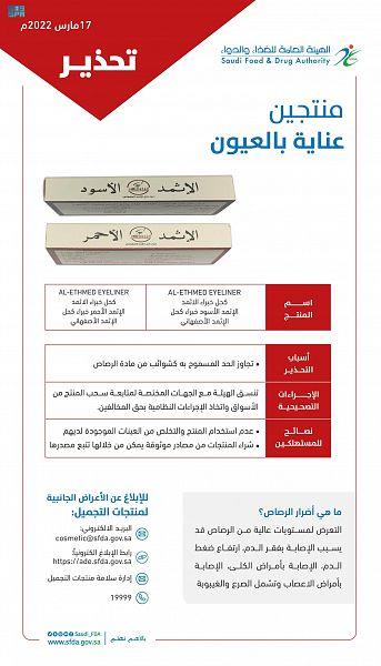 من جهة أخرى، حذرت الهيئة من منتجي عناية بالعيون هما كحل خبراء الإثمد، والإثمد الأسود والأحمر، وذلك لاحتوائهما على نسبة عالية من الرصاص، تجاوزت الحد المسموح به كشوائب بلائحة متطلبات السلامة في مستحضرات التجميل والعناية الشخصية رقم SFDA.CO/GSO 1943:2016 .