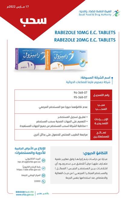 قررت الهيئة العامة للغذاء والدواء تعليق تسجيل وسحب مستحضر(RABEZOLE) تركيز 20 ملغ و10 ملغ والمسجلة بالهيئة برقمي (95-368-07)(96-368-07).