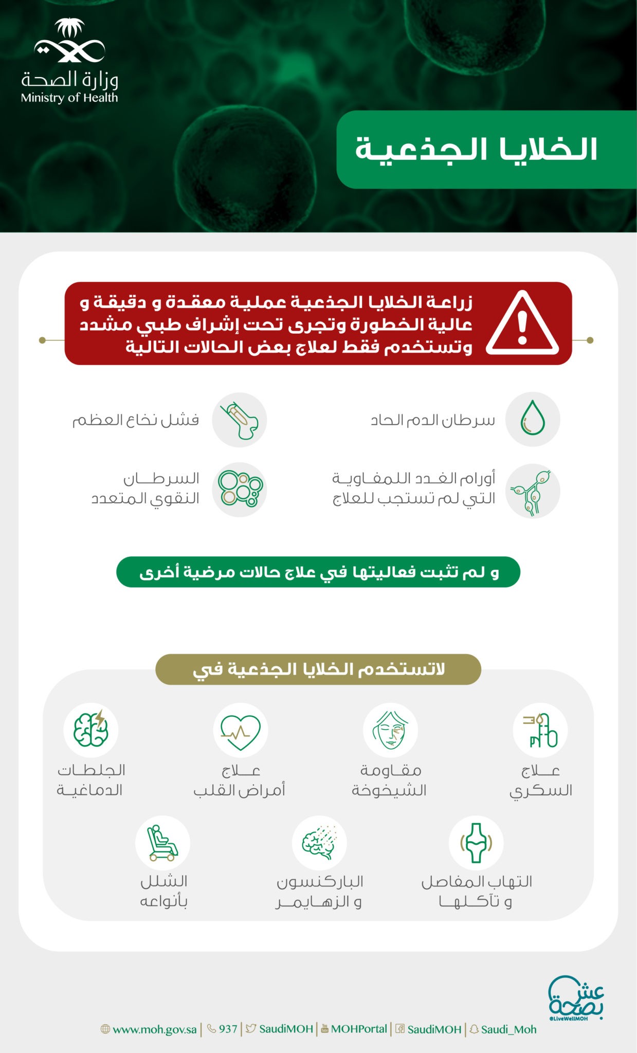 وتابعت وزارة الصحة، إن الخلايا الجذعية لا تعالج السكري ولا الشيخوخة ولا أمراض القلب والجلطات الدماغية والتهاب المفاصل وتآكلها وألزهايمر والشلل بأنواعه.