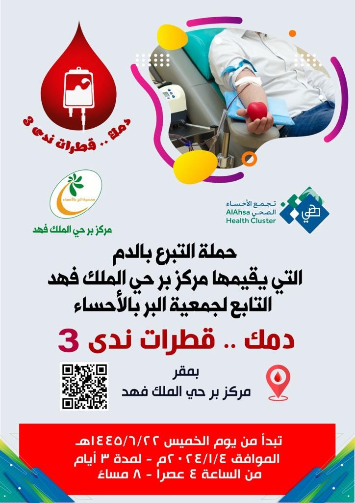 يقيم مركز بر حي الملك فهد التابع لجمعية البر بالأحساء حملته الثالثة للتبرع بالدم تحت شعار "دمك .. قطرات ندى"، بالشراكة المجتمعية مع التجمع الصحي بالأحساء مممثلاً في مستشفى الملك فهد بالهفوف.