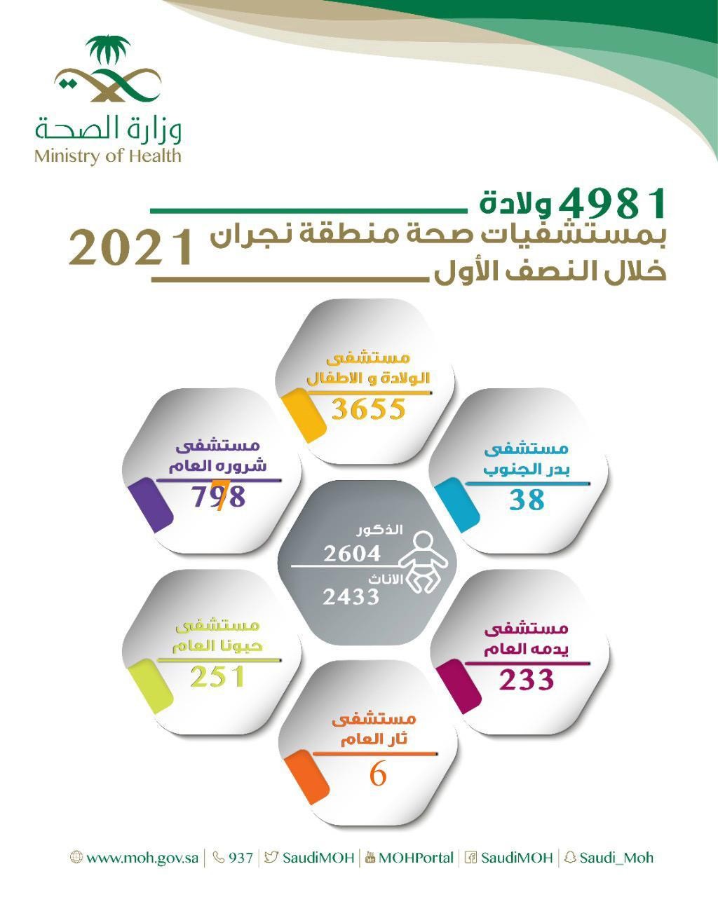 بلغ عدد المواليد بمستشفيات صحة نجران خلال النصف الأول من العام الجاري 4981 مولودا حيث بلغ عدد الذكور 2604 و 2433 من الإناث.