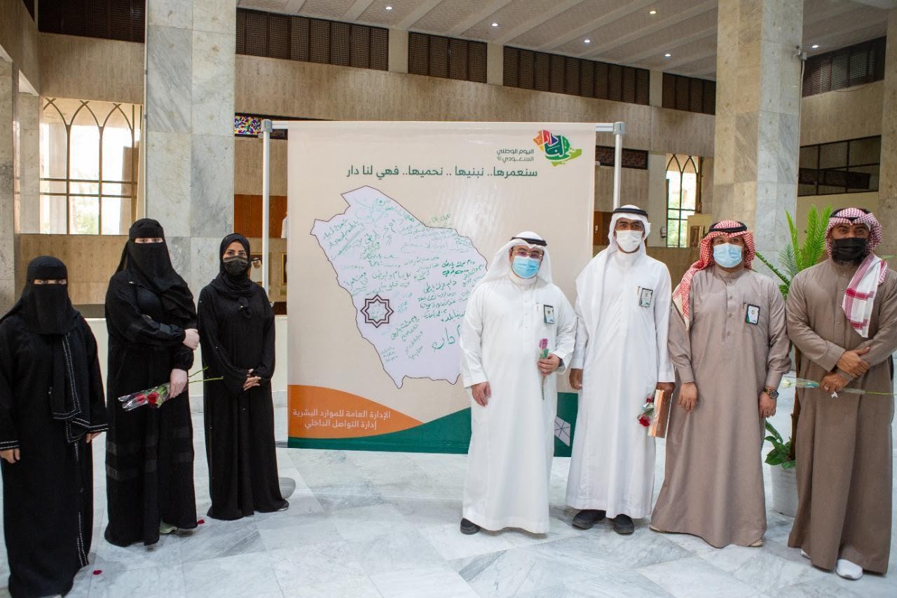 و مراجعيها ، حيث نظّمت إدارة العلاقات العامة والإتصال المؤسسي مواقع متفرقة بالأمانة لاستقبال منسوبي الأمانة ومراجعيها بالورد والشوكولاتة وأعلام وهداية عينية وأوشحة تحمل شعار #هيلنادار ليحتفل الجميع بفرحة اليوم الوطني، فيما شارك معالي أمين العاصمة المهندس محمد بن عبدالله القويحص والوكلاء الموظفين والموظفات في جدارية لوحة (مشاعر ولاء) نُثر فيها مشاعر الوفاء والحب للوطن الغالي.