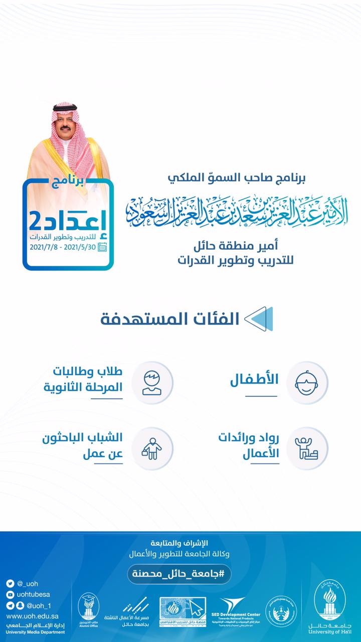 وكيل جامعة حائل للتطوير والأعمال :برنامج الأمير عبدالعزيز بن سعد أمير منطقة حائل للتدريب وتطوير القدرات يحتوي على 77 برنامجاً تدريبيًّا نوعيًّا.