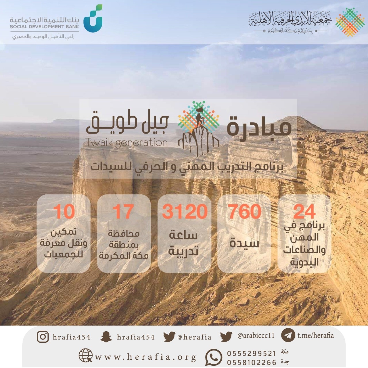 أطلقت جمعية الأيدي الحرفية الأهلية بمنطقة مكة المكرمة وبدعم من بنك التنمية الاجتماعية ، الراعي الوحيد والحصري ، مبادرة جيل طويق تحت شعار (همة وطموح يعانق السماء ) لتدريب وتأهيل 760 سيدة في 17 محافظة بمنطقة مكة المكرمة بواقع 3120 ساعة تدريبية في المهن والصناعات اليدوية.