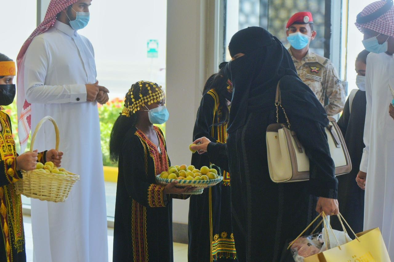 بمتابعة من صاحب السمو الملكي الأمير الدكتور حسام بن سعود بن عبدالعزيز ، أمير منطقة الباحة، استقبل مطار الملك سعود المسافرين القادمين بالورود والحلويات والفواكة الموسمية التي تشتهر بها المنطقة ، وذلك من خلال مبادرة نفذتها الغرفة التجارية بالمنطقة بالشراكة مع لجنة المبادرات والبرامج بمحافظة العقيق ، وذلك بحضور سعادة محافظ العقيق سالم بن مسير بن طواله ، ونائب رئيس الغرفة التجارية بالباحة عبدالله بن محمد رافع .