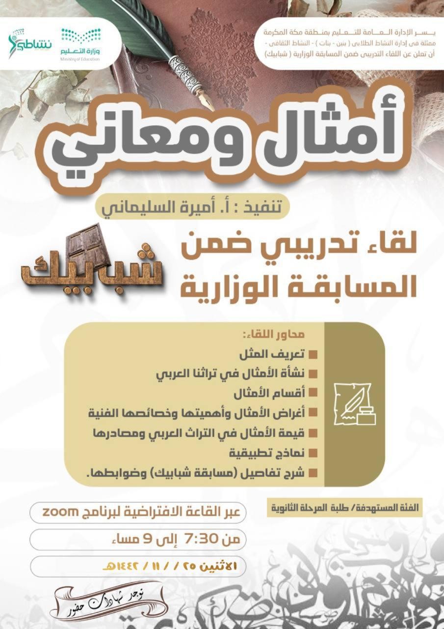 نفذت الإدارة العامة للتعليم بمنطقة مكة المكرمة ممثلة بإدارة النشاط الطلابي ( بنين ـ بنات )، المجال الثقافي، اللقاء التدريبي للمسابقة الوزارية ( شبابيك ) ضمن برامج نشاطي” لصيف 1442هـ-2021م” والتي تهدف إلى ربط الطلاب والطالبات باللغة العربية الأصيلة من خلال البحث في الأمثال العربية الأصيلة وبيان قصة المثل وارتباط روايته بحادثة أو تجربة ما، كما تم إثراء الطلاب والطالبات بمايتعلق بالأمثال العربية من حيث نشأتها ومصادرها وقيمتها في التراث العربي ، كما تمت الإشارة إلى أقسام الأمثال وأنواعها وبعض النماذج التطبيقية والحالات المشابهة التي تضرب بها بعض الأمثال.