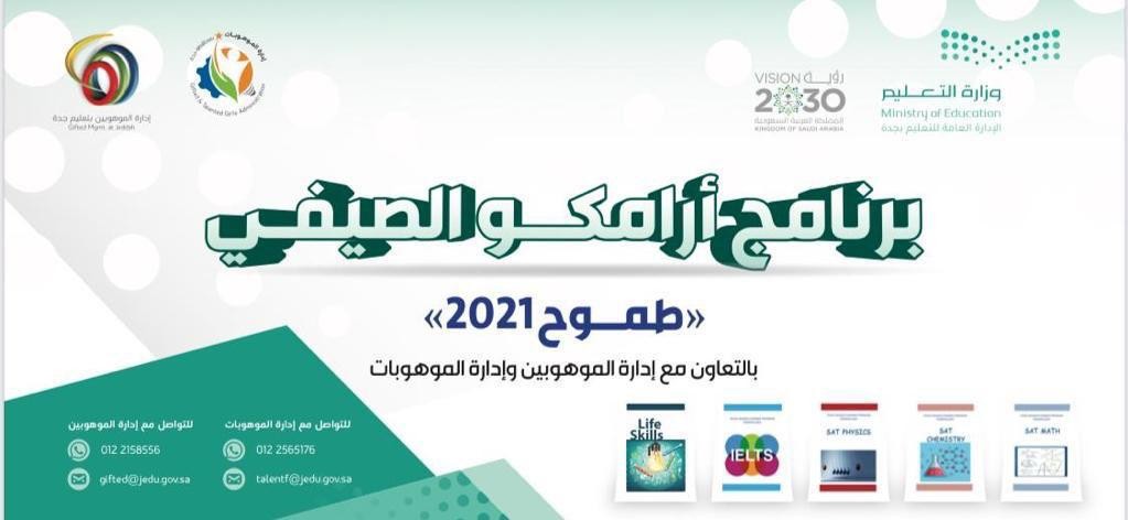 اختتمت أمس الأول فعاليات البرنامج التدريبي الصيفي (طموح 21) تحت شعار (تطوير مواهب الغد يبدأ اليوم)، الذي نفذته الإدارة العامة للتعليم بجدة ممثلة في إدارتي الموهوبين والموهوبات بالشراكة مع أرامكو، البرنامج استفاد منه أكثر  300 طالب وطالبة، واستمر على مدى 5 أسابيع حضر الطلاب والطالبات خلالها  أكثر من  150 ساعة تدريبية عن بُعد.