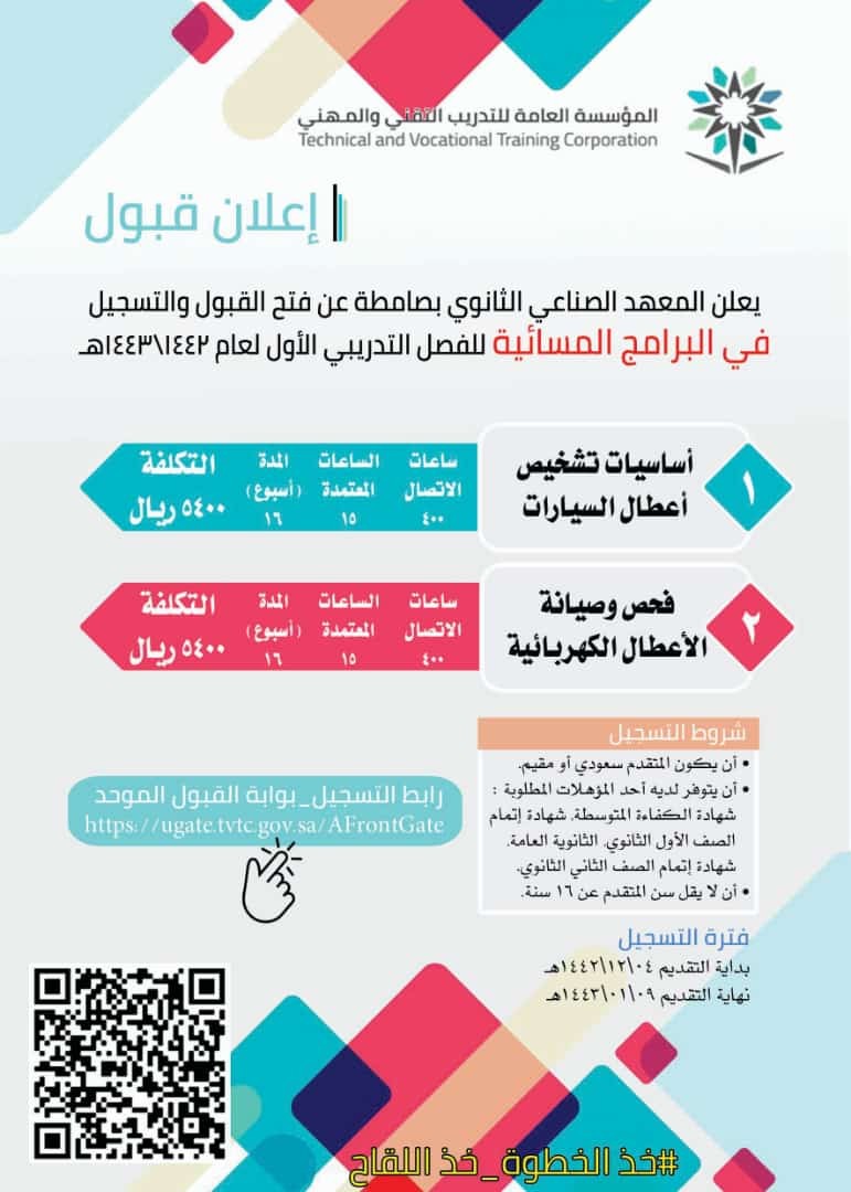 . في برنامج أساسيات تشخيص أعطال السيارات، وبرنامج فحص وصيانة الأعطال الكهربائية، ويمتد https://ugate.tvtc.gov.sa/AFrontGateكل برنامج 16 أسبوعاً .