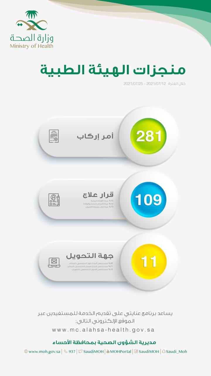 تم اصدار 281 امر اركاب، وبلغ عدد الجهات المحول لها11 جهة، حيث تقوم الهيئة الطبية العامة بصحة الاحساء بتقديم العديد من الخدمات للمستفيدين من المواطنين، ودراسة حالتهم الطبية ومعرفة من يحتاجون إلى مراكز طبية متقدمة، وتم التنسيق مع الجهات التي يتوفر بها علاج الحالة ومخاطبتها، سواء داخل المملكة او خارجها مع الهيئة الطبية العليا بالرياض لتوفير العلاج للحالة بالخارج.