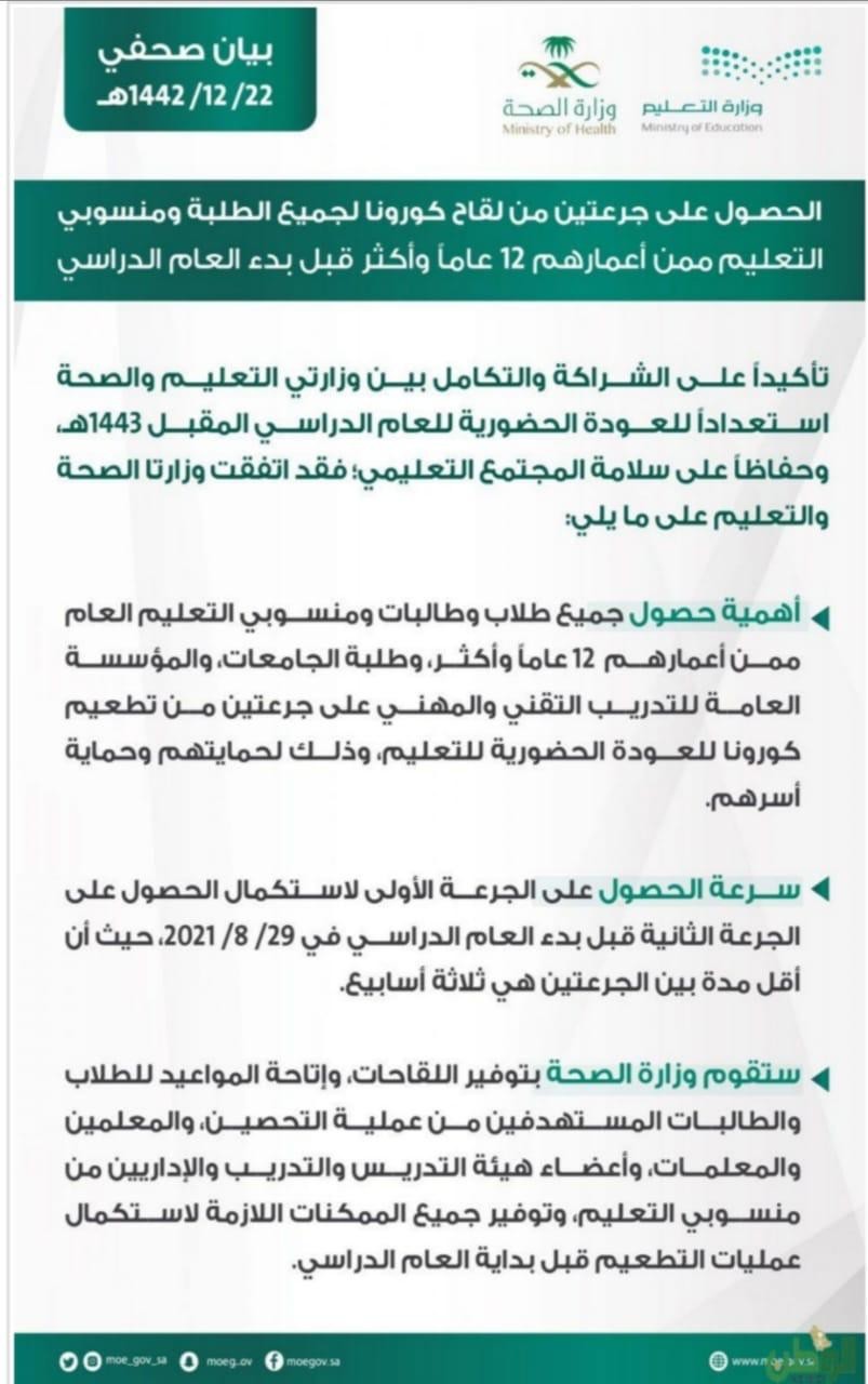وختم البيان “ستقوم وزارة الصحة بتوفير اللقاحات، وإتاحة المواعيد للطلاب والطالبات المستهدفين من عملية التحصين والمعلمين والمعلمات، وأعضاء هيئة التدريس والتدريب والإداريين من منسوبي التعليم، وتوفير جميع الممكنات اللازمة لاستكمال عمليات التطعيم قبل بداية العام الدراسي.