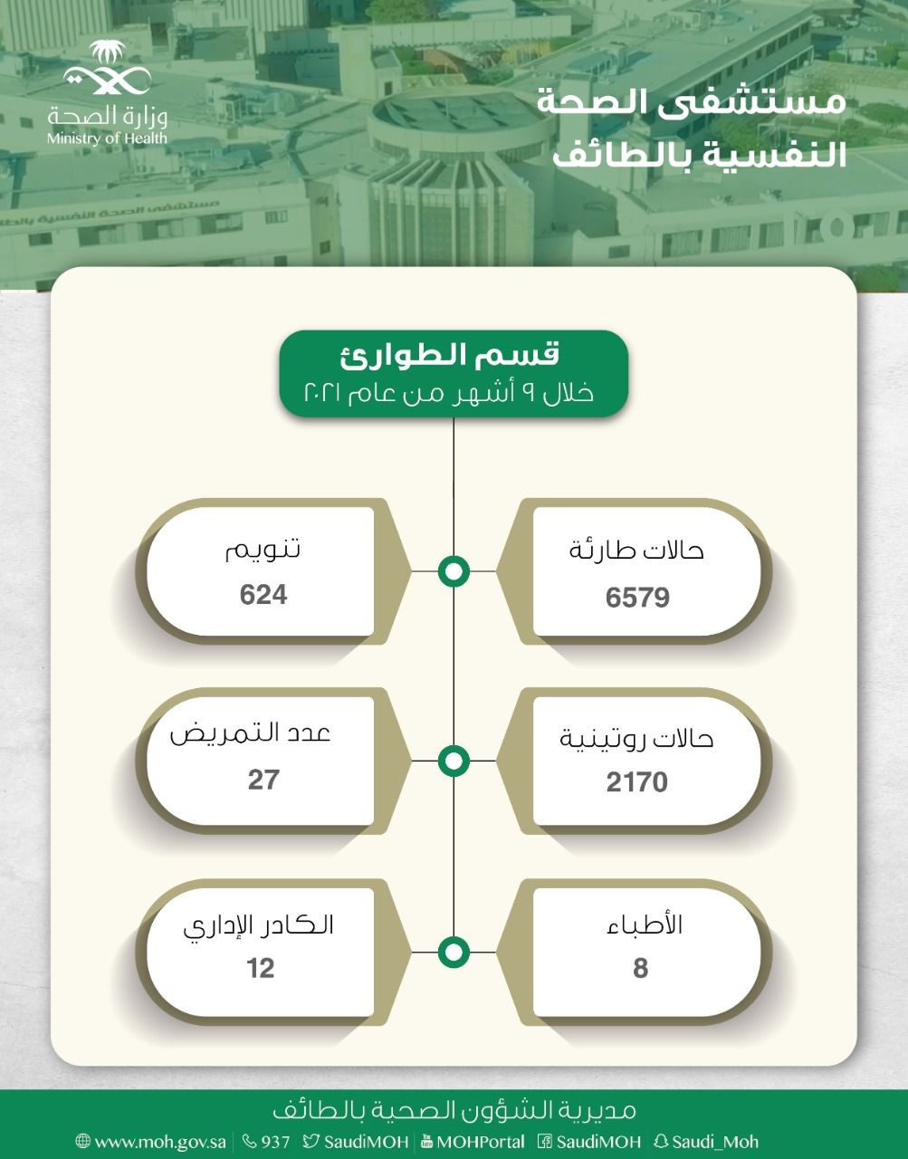 كشف مستشفى الصحة النفسية بالطائف ان 10% من مراجعي الطوارئ ,تم تنويمهم ,كونهم ضمن الحالات الطارئة التي وصلت الى اقسام الطوارئ..ولفت المتحدث الرسمي بالشؤون الصحية سراج الحميدان  الى ان هذه الاحصائيات تمثل الثلاثة ارباع من العام الجاري 2021.