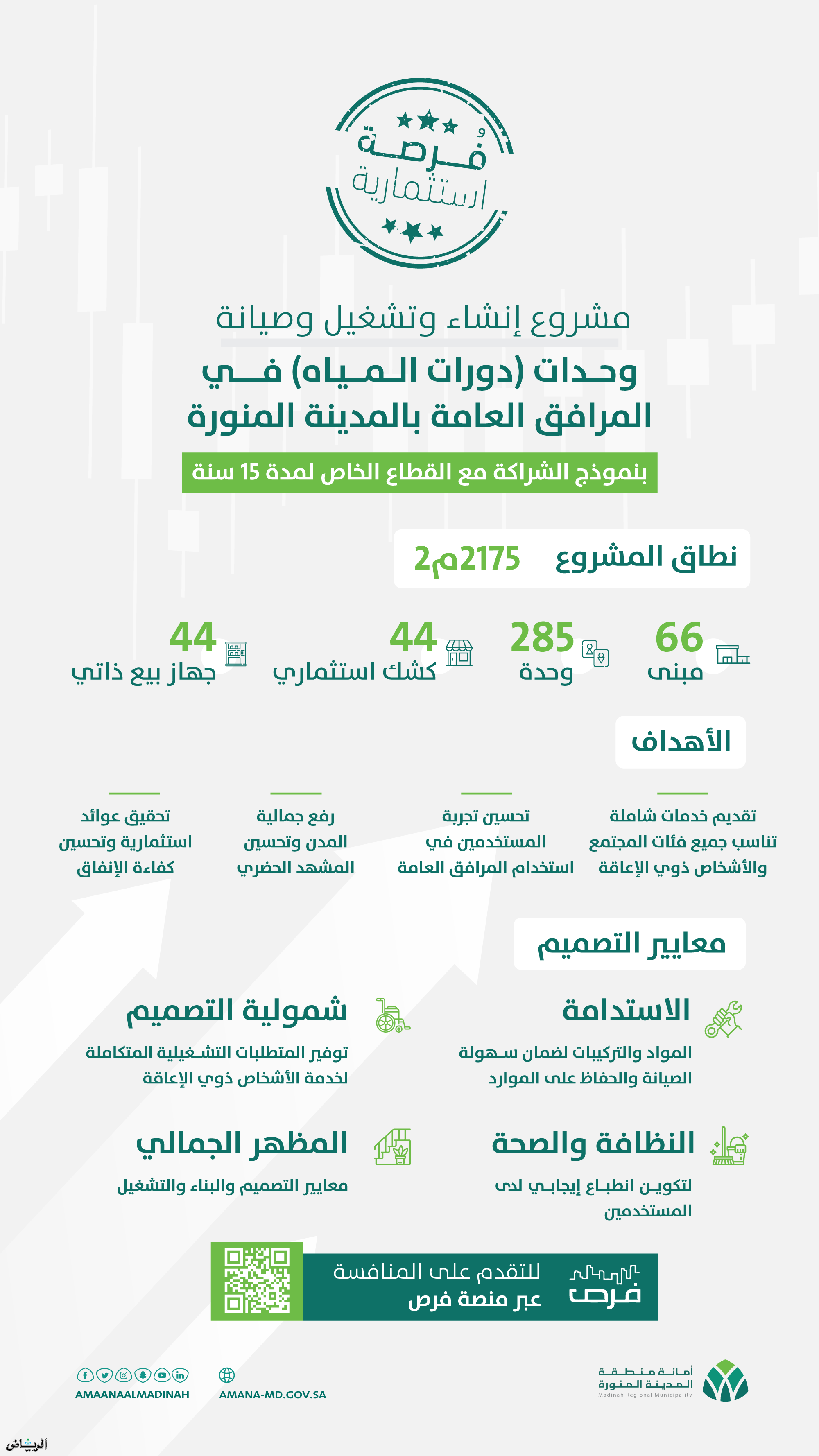أعلنت أمانة منطقة المدينة المنورة عن طرح مشروع إنشاء وصيانة وتشغيل 66 مبنى خدمات في المرافق العامة بالمدينة المنورة كفرصة استثمارية للقطاع الخاص وفق ضوابط وتصاميم تراعي متطلبات المشهد الحضري .