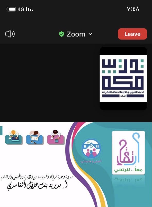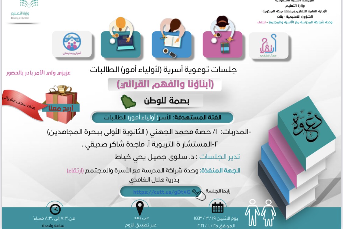 بحضور مساعدة المدير العام للشؤون التعليمية، نظمت الإدارة العامة للتعليم بمنطقة مكة المكرمة ممثلة بوحدة شراكة المدرسة مع الأسرة والمجتمع (ارتقاء ) -بنات - اليوم الاثنين الموافق ١٤٤٣/٣/١٩هـ الجلسة التوعوية الأسرية (أبناؤنا والفهم القرائي) ضمن تفعيل مبادرة (أسرتي ومدرستي) وتحت شعار "بصمة للوطن" وذلك بالتعاون مع مكاتب التعليم من الساعة ٧:٣٠-٨:٣٠ مساءً عبر القاعة الافتراضية ببرنامج الزوم ، نفذته مديرة وحدة ارتقاء أ/ بدرية الغامدي وذلك بمشاركة المدربة حصة الجهني بالثانوية الأولى ببحرة المجاهدين والمستشارة التربوية ماجدة صديقي.