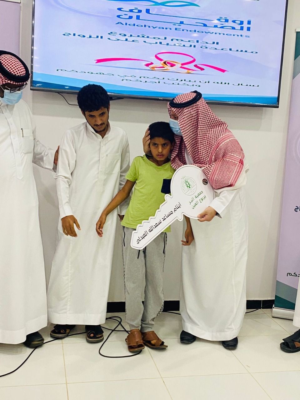 وفي نهاية الحفل قام محافظ محافظة أضم الأستاذ الفيفي ورئيس مجلس الإدارة بالجمعية بتسليم الشيكات للشباب المستفيدين من المشروع وهم المقبلين على الزواج حيث بلغت إجمالي المساعدات إلى ٢٠٠ ألف ريال، كما تم تسليم عشر وحدات سكنية لعدد من الأيتام والأرامل والأسر الفقيرة والمحتاجة.