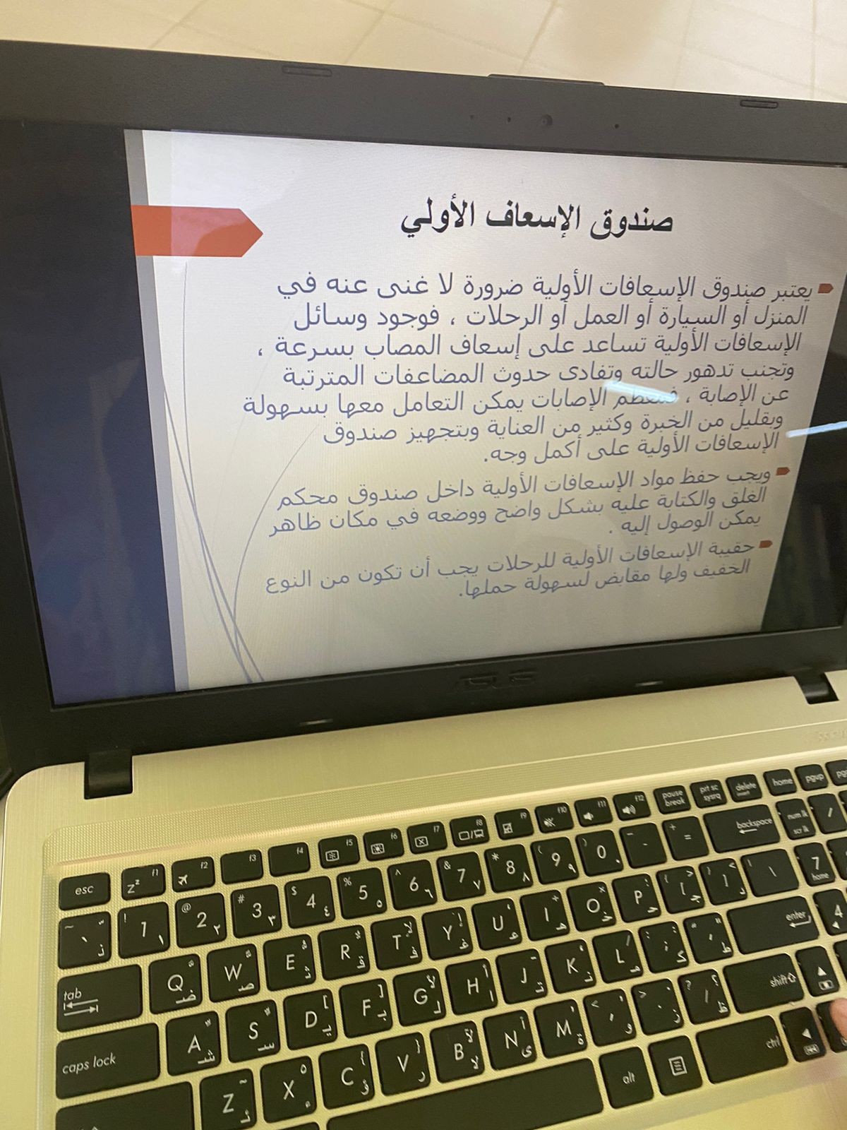بالتعاون مع إدارة الصحه العامة بالشؤون الصحية بمحافظة القريات أقام مركز التنمية الإجتماعية بالقريات وبالشراكة مع المدرسه الثانويه الثالثة عشر محاضره بعنوان(الإسعافات الاوليه )قدمتها الممرضه /وضحا العنزي في مقر المدرسة بحضور الطالبات حيث تناولت التعريف بالاسعافات الاوليه والحالات التي يمكن تقديم الاسعافات لها والتوعيه والتثقيف بجوانب الاسعافات الاوليه