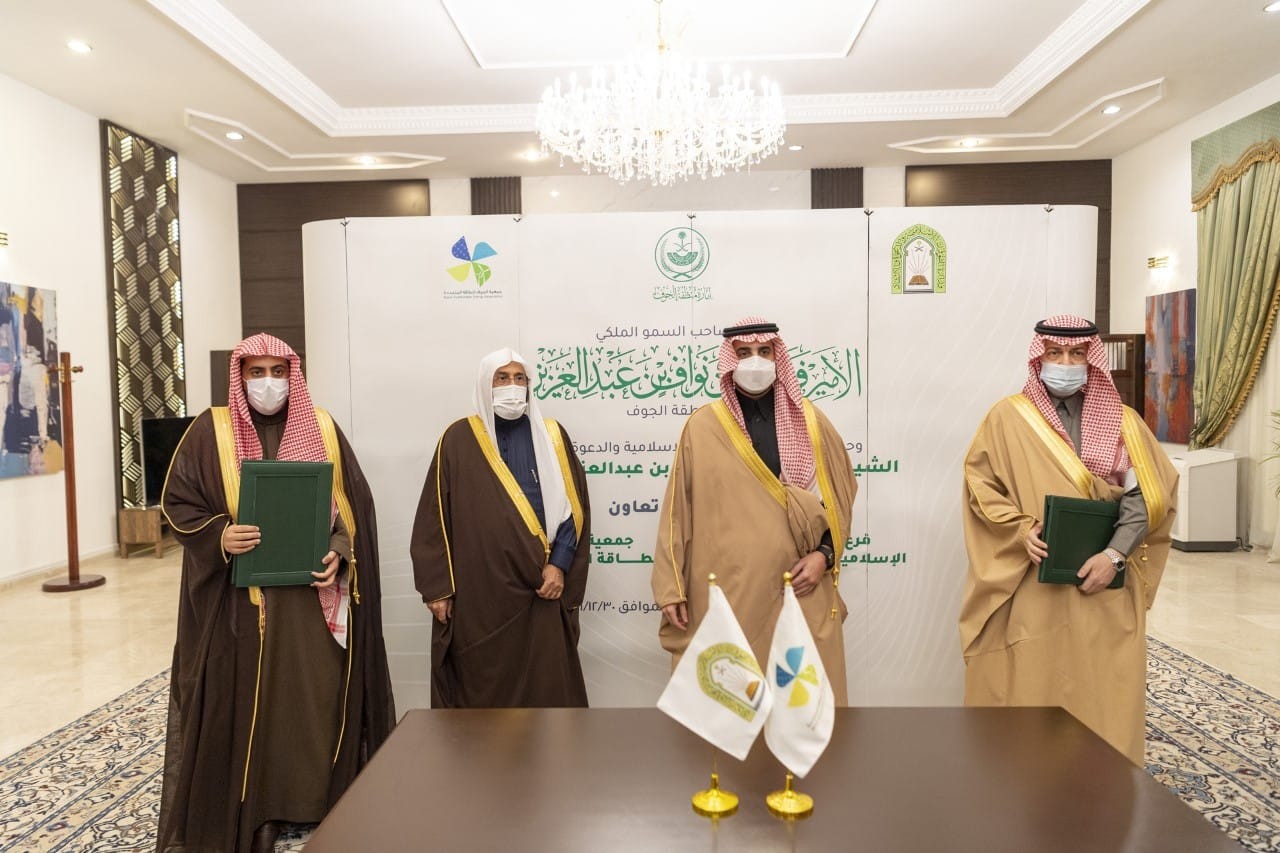 عقب ذلك شهد سمو أمير المنطقة الرئيس الفخري لجمعية الجوف للطاقة المتجددة ومعالي وزير الشؤون الإسلامية ، مراسم توقيع اتفاقية بين فرع الوزارة بالمنطقة والجمعية، والتي وقعها المدير العام للفرع الشيخ محمد بن دخيل الدخيل والأمين العام للجمعية الدكتور جهاد زين العابدين.