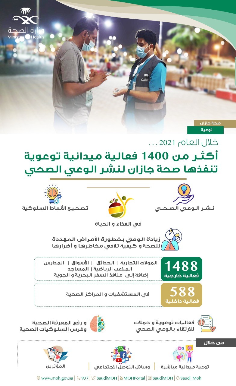 نفذت صحة جازان ممثلة في إدارة التوعية الصحية وأقسام التوعية بالمستشفيات والقطاعات الصحية عدد 1488 فعالية ميدانية توعوية تم تنفيذها خلال هذا العام بمختلف قرى مراكز ومحافظات منطقة جازان خلال العام 2021 م