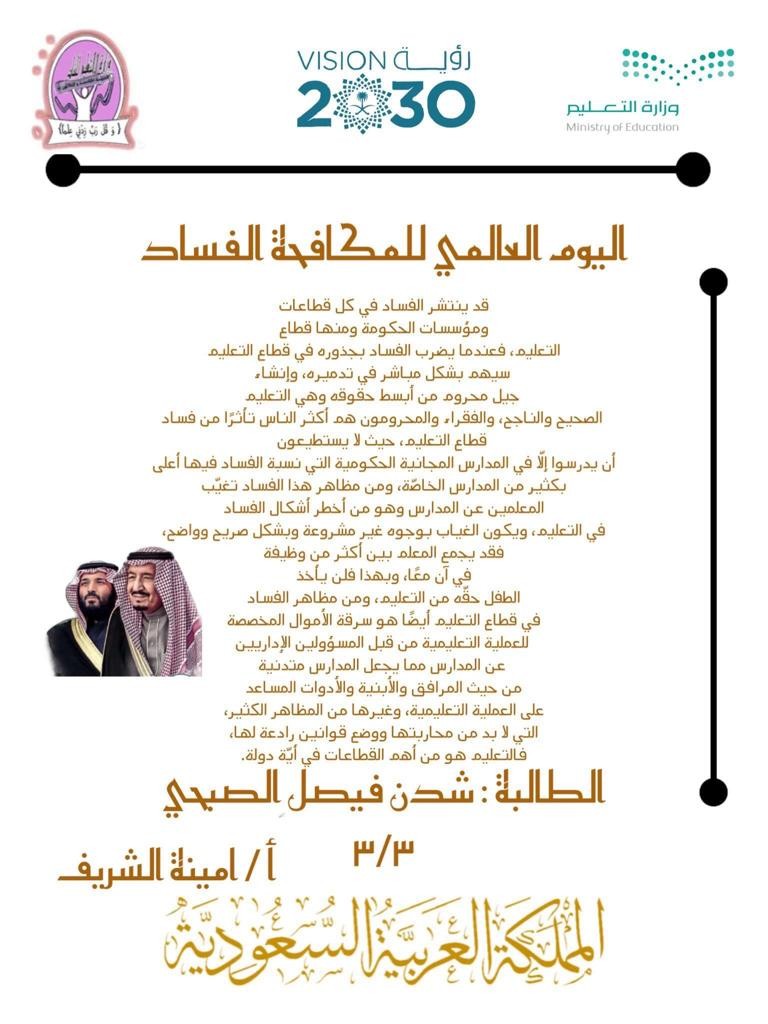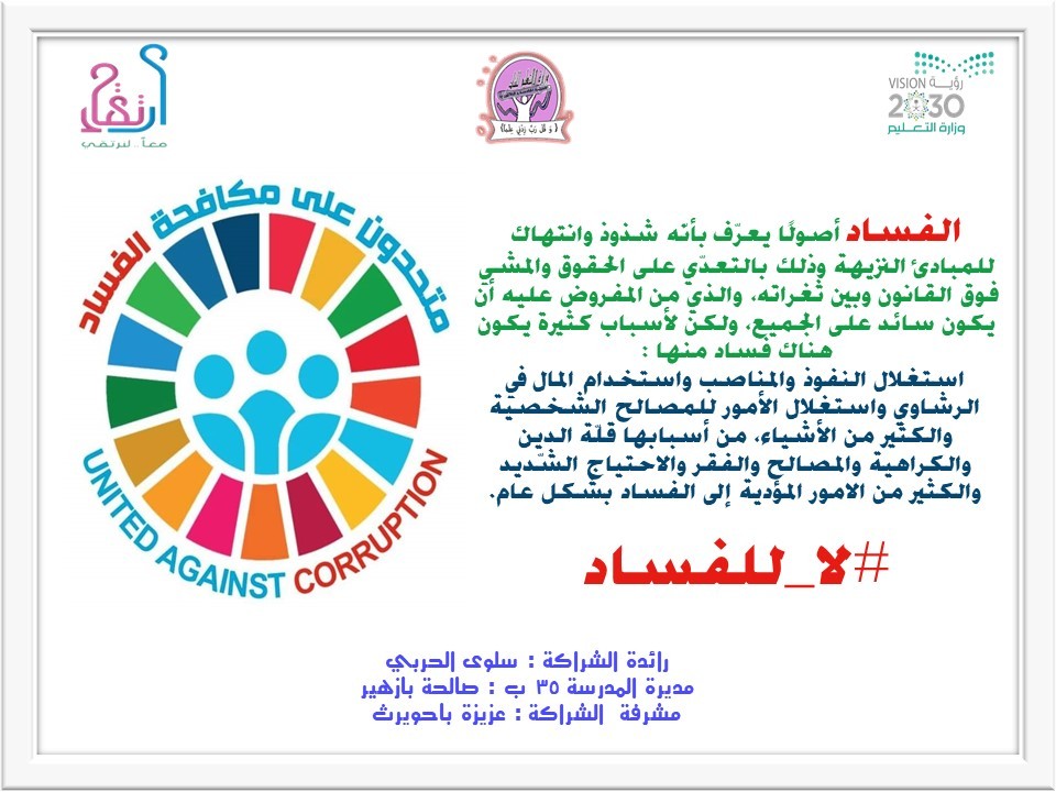 نفذت الابتدائية الخامسة والثلاثون ممثلةً بمكتب تعليم شمال مكة بالإدارة العامة للتعليم بمنطقة مكة المكرمة ولمدة أسبوع إبتداءً من يوم الأحد الموافق 22 / 5 / 1443هـ، تفعيلاً لليوم العالمي الدولي لمكافحة الفساد تحت شعار (متحدون على مكافحة الفساد)، نفذهُ كُلاً من رائدة النشاط الاء السالمي ورائدة الشراكة سلوى الحربي بمساندة منسوبات المدرسة بإشراف مديرة المدرسة صالة بازهير.