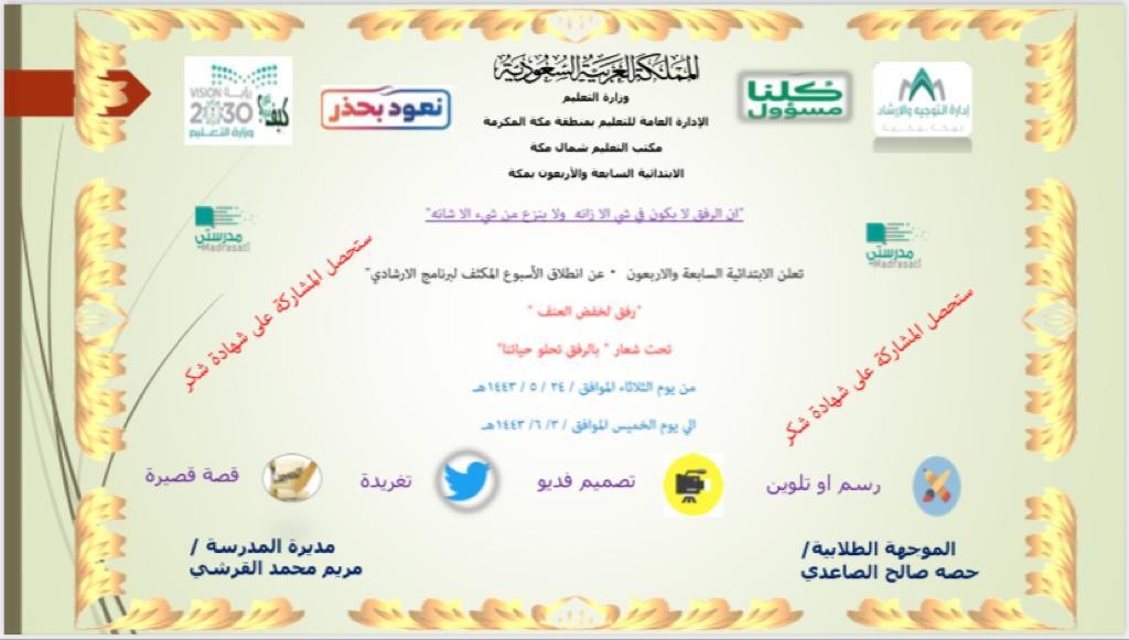 أقامت الابتدائية السابعة والأربعون التابعة لمكتب تعليم شمال مكة بالإدارة العامة للتعليم بمنطقة مكة المكرمة ولمدة أسبوع إبتداءً من يوم الأحد الموافق 22 / 5 / 1443هـ، فعاليات الأسبوع الإرشادي المكثف رفق نفذهُ الموجهة الطلابية حصة الصاعديبمساندة منسوبات المدرسة وإشراف مديرة المدرسة مريم القرشي.