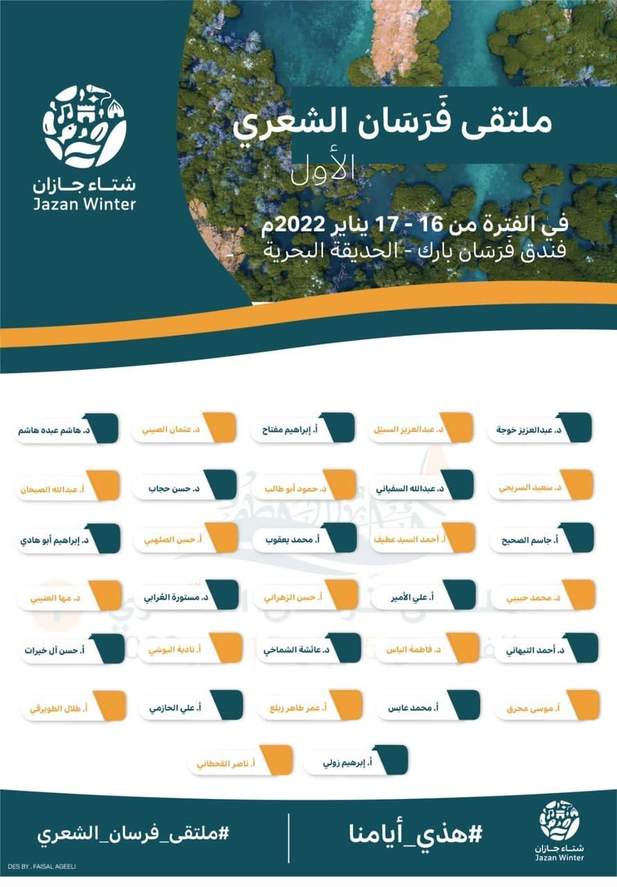 تستضيف محافظة جزر فرسان يوم الأحد المقبل ، ملتقى فرسان الشعري الأول ، وذلك ضمن فعاليات مهرجان شتاء جازان 22 ، الذي يُقام حاليًا تحت شعار “هذي أيامنا”.