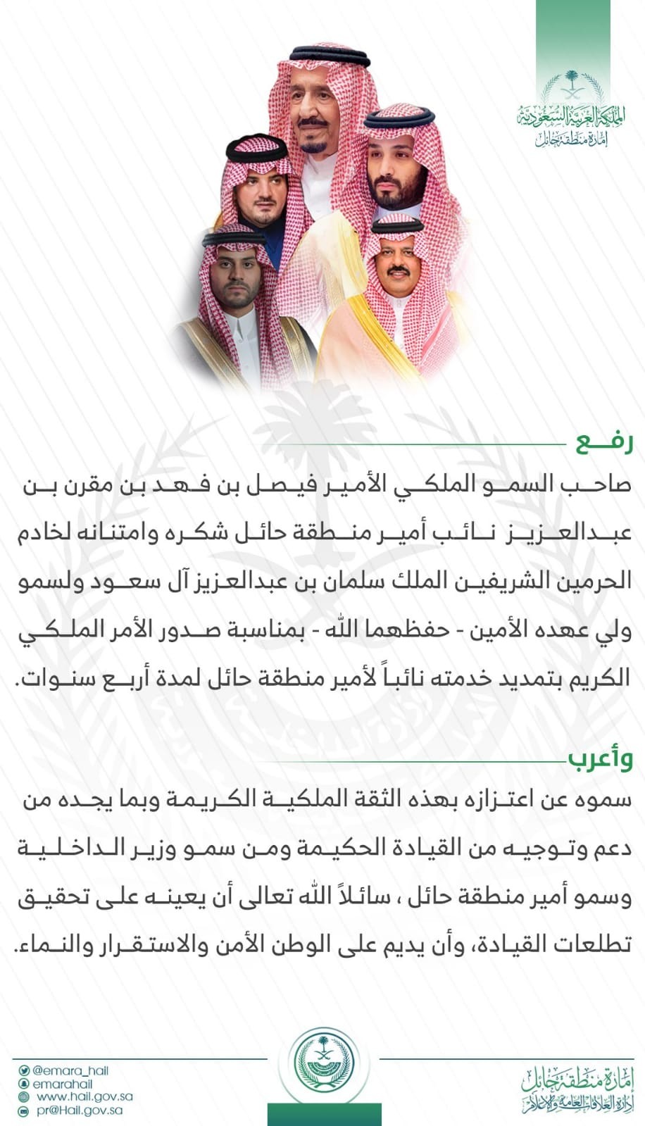 رفع صاحب السمو الملكي الأمير فيصل بن فهد بن مقرن بن عبدالعزيز نائب أمير منطقة حائل شكره وامتنانه لخادم الحرمين الشريفين الملك سلمان بن عبدالعزيز آل سعود ولسمو ولي عهده الأمين – حفظهما الله – بمناسبة صدور الأمر الملكي الكريم بتمديد خدمته نائباً لأمير منطقة حائل لمدة أربع سنوات.