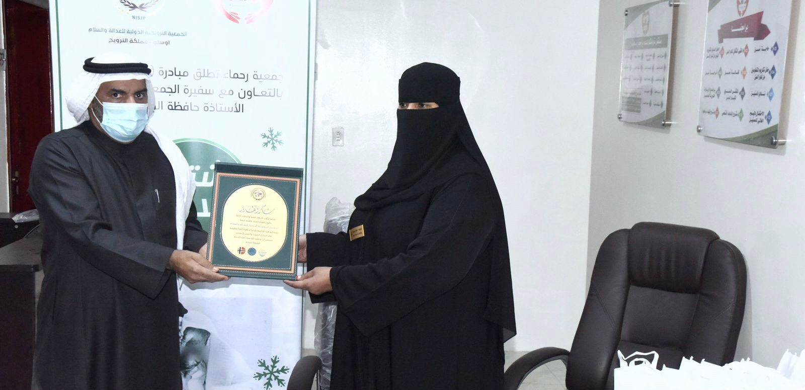 وفي ختام المبادرة كرمت سفيرة النوايا الحسنة الأستاذة "حافظه الجوف" جمعية رحماء بدرع تذكاري لرعايتها واحتضانها للمبادرة.