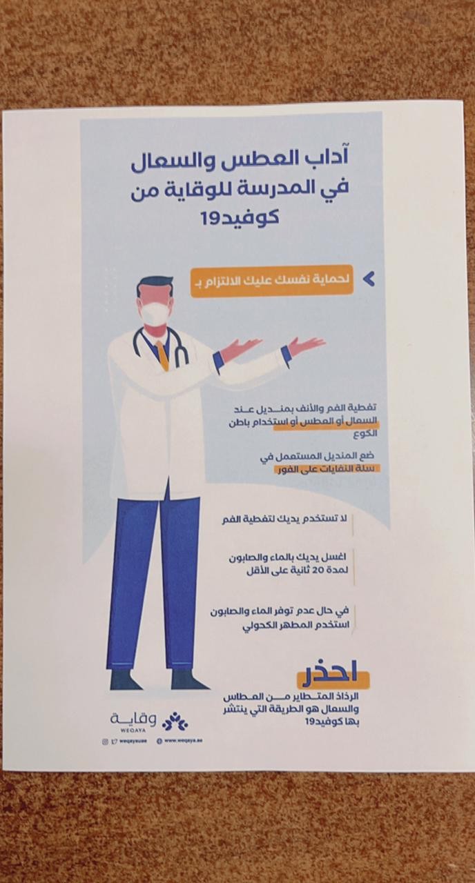 حيثُ نفذت ابتدائية البشرى الأهلية بمتابعة مديرة المدرسة أسماء النهاري برامجاً توعويةً تضمنت التأكيد على أخذ الاحترازات الوقائية، والتثقيف الصحي والتوعوي بفيروس كورونا، كذلك تكثيف النشرات التوعوية للحد من انتشاره، فيما تم الاستعداد للعودة الحضورية بالتأكد من اتباع خطة الاحترازات الوقائية، مع تجهيز ركن توعوي، وتوفير (مقياس الحرارة ـ معقم ـ مناديل ـ قفازات)، كما وزعت نشرات تثقيفية وتوعوية، والتأكيد على تطبيق البروتوكولات في مقر المدرسة والاهتمام بالتهيئة النفسية للطالبات.