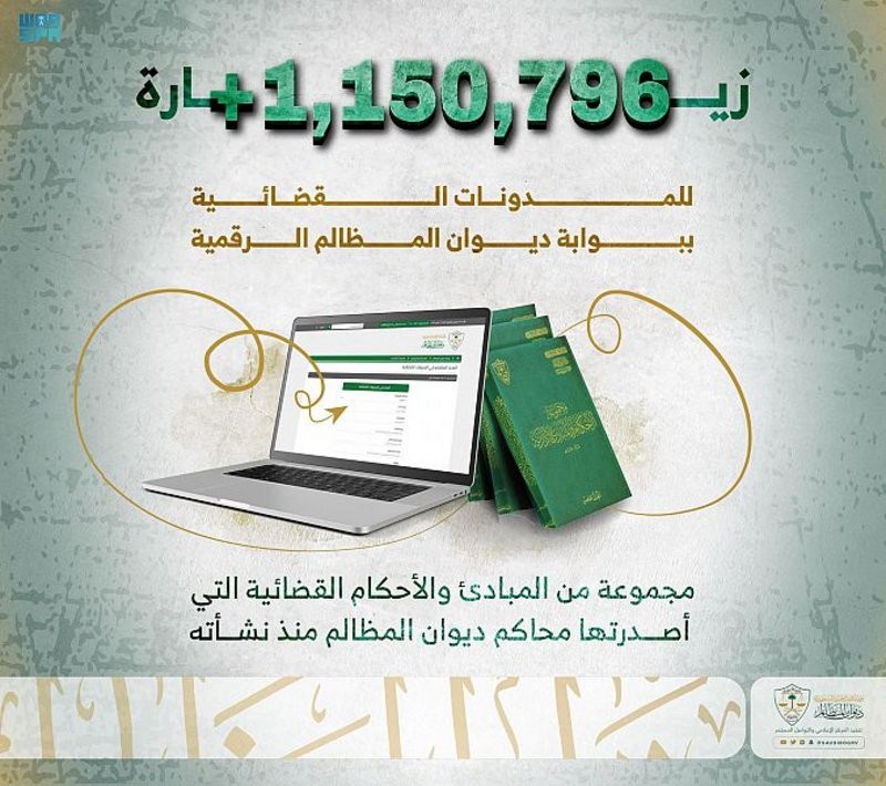 بلغ عدد زيارات منصة المدونات القضائية في بوابة ديوان المظالم الرقمية 1,150,796 زيارة منذُ إطلاق المنصة، التي تحوي أكثر من عشرة آلاف من الأحكام والمبادئ المنتقاة من أحكام محاكم ديوان المظالم في 16 مدونة و174 مجلداً.